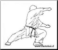 Jyuji uke gedan (parada en cruz descendente). Desde el exterior descender los puños y cruzarlos con fuerza, con los dorsos enfrentados y de forma que entre ambas muñecas entre una piema. La cadera se encuentra de frente y baja, el torso vertical y los dorsales tensos.
